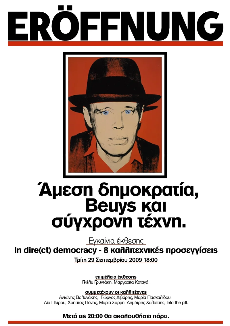 Η εικαστική αναζήτηση βεβαίως απέχει μακράν της επιστημονικής καθότι διατρέχει την κοινωνία σε διαφορετικές τροχιές. Μέσα από αυτές τις τροχιές ο Αντώνης Βολανάκης δημιουργεί ένα ιδιόμορφο τρίο εκκινούμενος από την ανθρωποσοφία του Ρούντολφ Στάινερ –τρανός εμπνευστής του Μπόυς- και προκαλώντας τον θεατή να εξηγήσει με τον δικό του τρόπο στο λαγό-που αναμένει στην έκθεση- τις εικόνες που του παράγονται από το τριπλό ιδανικό κοινωνικό μοντέλο του Στάινερ, την οξεία πολιτική-αλλά και ποιητική- ματιά του Θερβάντες και από τον κυκλικό -και ατέρμονο γαρ- ονειρικό κόσμο των λογοτεχνικών Φίνεγκαν. Και με όποια σειρά θέλει. Ο Γιώργος Διβάρης πάλι, απομονώνοντας σκόρπιες αλλά σαφείς εικόνες από πολεμικές ανταποκρίσεις, επισημαίνει επικριτικά ως Υπεροψία τόσο την αλαζονεία της εξουσίας, όσο και την αδράνεια του ενημερωμένου μεν αμέτοχου δε σύγχρονου πολίτη. Για τη Μαρία Πασχαλίδου η άσκηση της δημοκρατίας σήμερα όχι μόνο δεν αντιτάσσεται στον αποκλεισμό και την επιβολή ομοιογένειας αλλά και στρατεύεται υπέρ μιας απειλητικά επεκτεινόμενης βιοπολιτικής, ενώ η καρτ-ποστάλ παραδεισένια εικόνα της Ελλάδας που άλλα υπόσχεται και άλλα προσφέρει σε μετανάστες και μη, υπονομεύεται σκωπτικά από τη Λία Πέτρου σε ένα έργο-σχόλιο των δύο όψεων της κάθε αλήθειας. Και αν από τη μία οι απροσδιόριστες γλυπτικές φόρμες του Χρήστου Πόνη που υπαινίσσονται βιομηχανικά αγαθά διεκδικούν το-δημοκρατικό- δικαίωμα του καλλιτέχνη στον αυτοπροσδιορισμό αποτείνοντας φόρο τιμής στα αυτοαναφορικά γλυπτά του Μπόυς, ο Δημήτρης Χαλάτσης ως αντίπαλο δέος αποδομεί τόσο το χτίσιμο μιας θρυλικής προσωπικής μυθολογίας όσο και τις δημοκρατικές δηλώσεις του Γερμανού καλλιτέχνη - σαμάνου παραφράζοντας εμπράκτως την περίφημη «υπερτιμημένη σιωπή του Ντισάν» σε «υπερτιμημένο λόγο του Μπόυς».