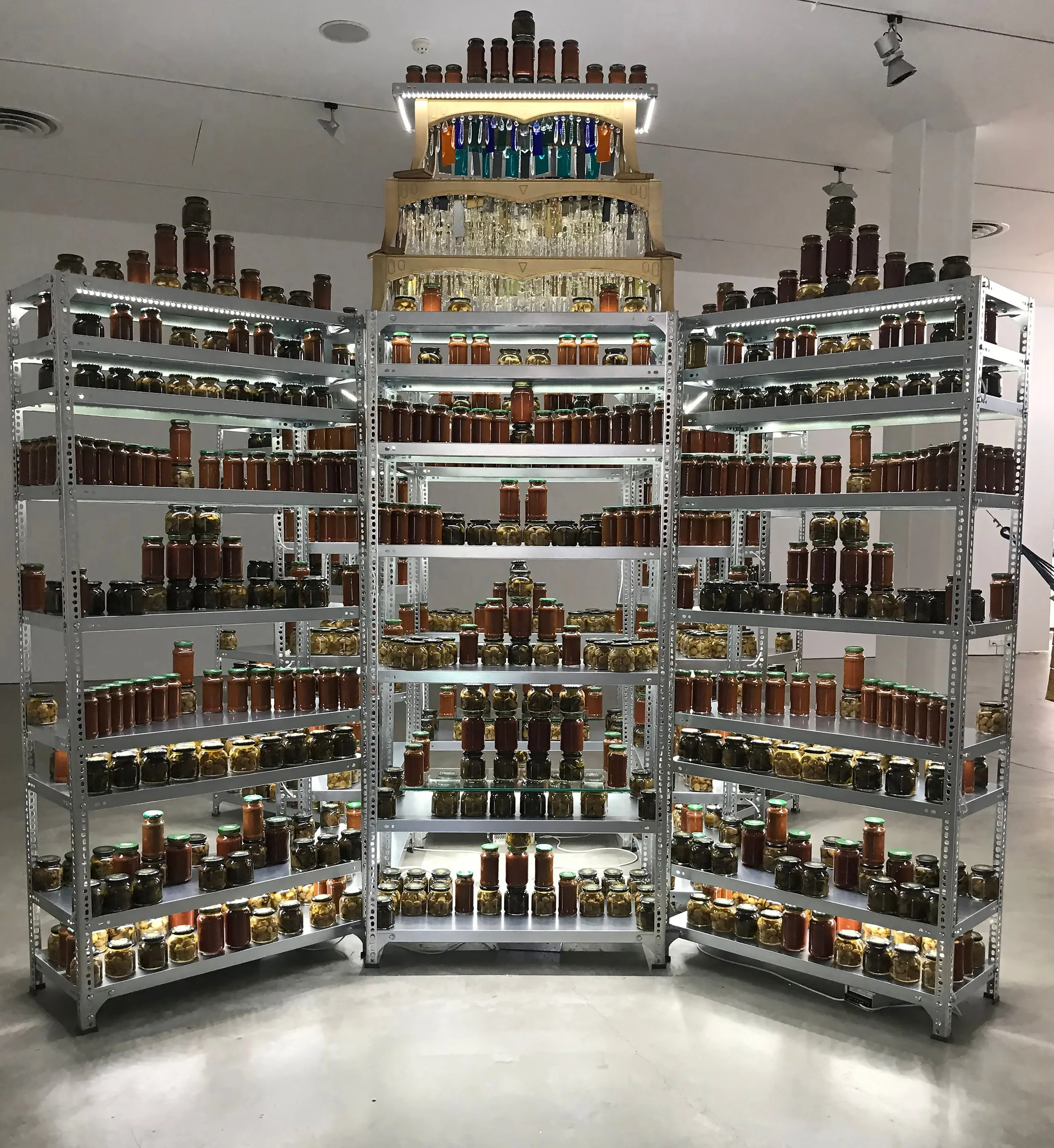 Κάποια άλλη στιγμή είχα βρει έτοιμες σάλτσες σφραγισμένες μέσα στα βαζάκια τους που είχαν λήξει πριν από 15 χρόνια! Έβγαλα τις ετικέτες από τα βάζα και τα γυάλισα σαν κάτι πολύτιμο (φυσικά δεν τα άνοιξα) και έγιναν αμέσως σχόλιο πάνω στις δυναμικές της αγοράς, στις «ιεραρχίες» στα ράφια του σούπερ μάρκετ, στην πράξη της συλλογής, στη μετουσίωση της ύλης μέσα από την τέχνη και βέβαια πάνω στην έννοια της «λήξης» και του εφήμερου.