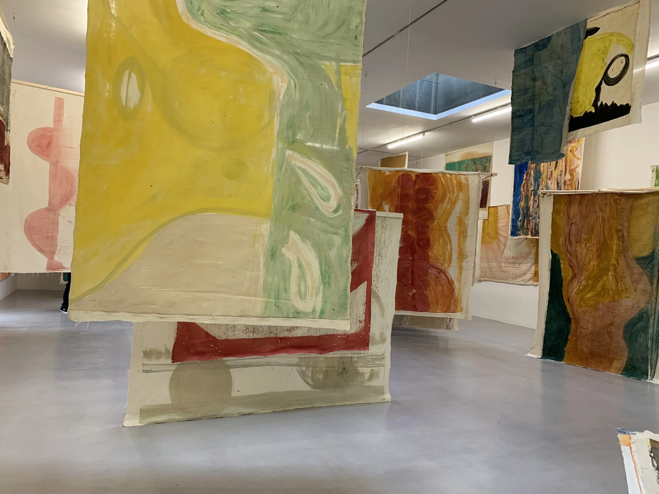 Καθώς περιφέρεσαι ανάμεσα στο χαοτικό σύμπλεγμα από τους ατελάρωτους καμβάδες της Vivian Suter στην έκθεσή της στο Camden Arts Center «Tintin’s Sofa», νομίζεις ότι μυρίζεις το χώμα, τα λουλούδια ή τον επικείμενο ερχομό μιας μπόρας. Οι ζωγραφικές της επιφάνειες αν και άτιτλες μιλούν ευφραδώς για τα δέντρα, τη λίμνη, τα σκυλιά της, τις αλλαγές των εποχών και των ανέμων. Μεταξύ άλλων κάπου διακρίνονται οι θέσεις του ήλιου, η γραμμή του ορίζοντα, ένα μονοπάτι, τα χρώματα της δύσης. Θέλεις να τους χαϊδέψεις και να τους ξεφυλλίσεις, ακόμα και να ξεκουραστείς πάνω τους, όπως ο Tintin, ο σκύλος της καλλιτέχνιδος, που κατά καιρούς τους επιλέγει για καναπέ (σύμφωνα με τον τίτλο της έκθεσης).
