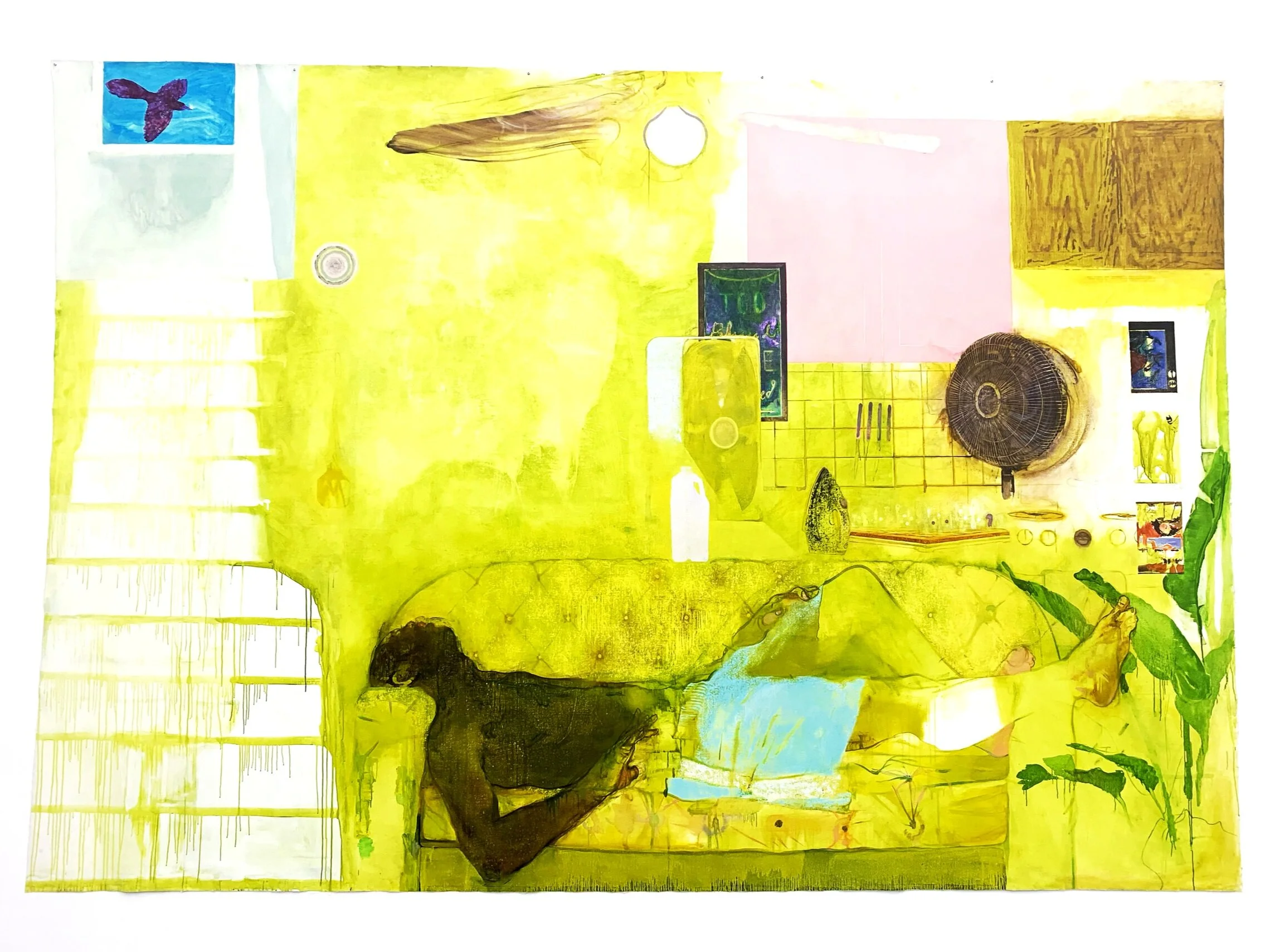 The big boom - a small black painting where you just can see a rope and a hand is called Swim. In Breonna’s living room, the staircase feels like blood. And up there, a bluebird.